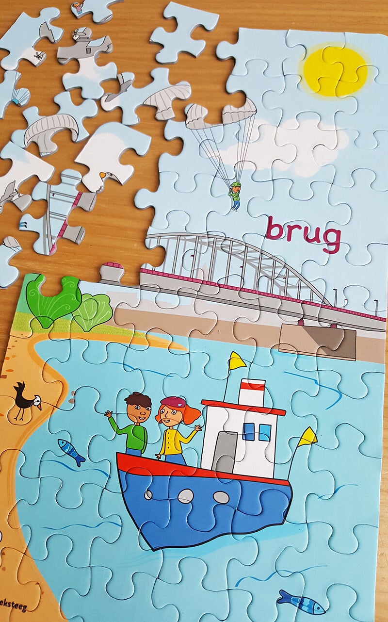 Vrolijke illustratieve kinderpuzzel van de John Frostbrug, daarboven een airborn vliegtuig en kinderen met parachute. Op de voorgrond zwaaiende kinderen op een boot, vissen in de rivier en vogels op de oever.